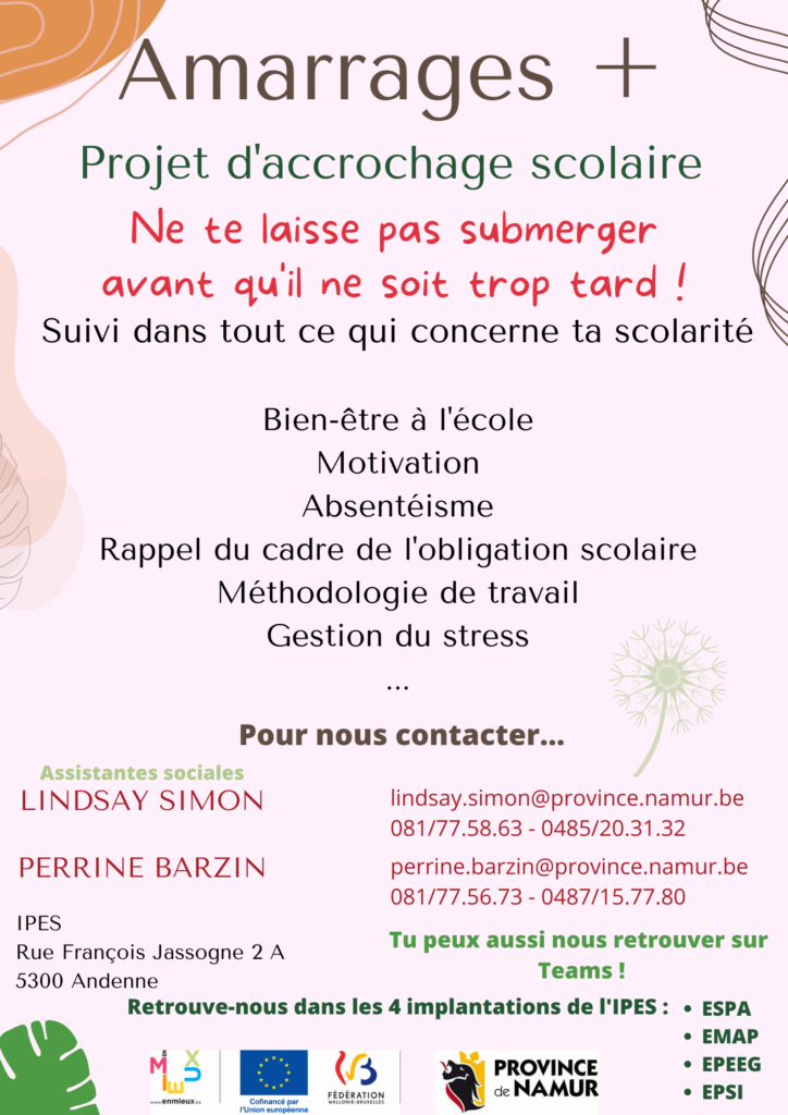 Encadré par Perrine et Lindsay, nos deux assistantes sociales engagées, Amarrages + est un projet d’accrochage scolaire pensé pour offrir aux jeunes un espace d’écoute, de soutien et de remobilisation.